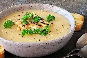 Cappuccino of porcini mushrooms (porcini cream soup) with dried tomato tartare